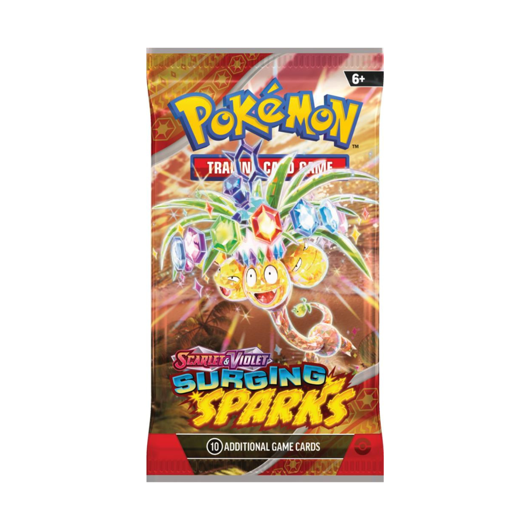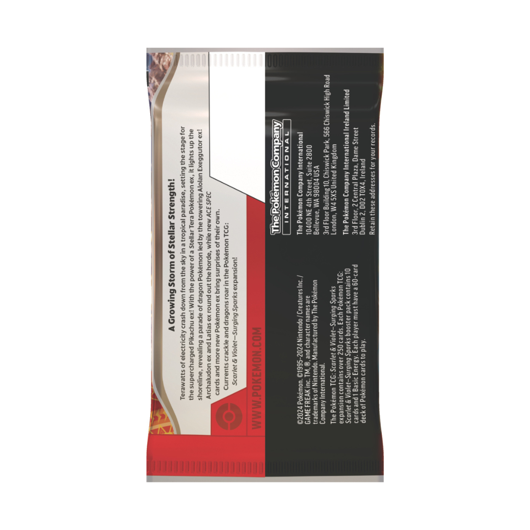 Bliski elektrike preplavljajo tropski raj in postavljajo oder za izjemno močnega Pikachu ex! Kot zvezdni Tera Pokémon ex osvetljuje obalo in razkriva veličastno parado zmajevskih Pokémonov, ki ji poveljuje mogočni Alolan Exeggutor ex. Archaludon ex in Latias ex se pridružujeta tej siloviti druščini, medtem ko nove ACE SPEC karte in drugi Pokémoni ex prinašajo nepričakovana presenečenja. Tokovi švigajo, zmaji rjovejo – vse to vas čaka v Pokémon TCG: Scarlet & Violet – Surging Sparks razširitvi!