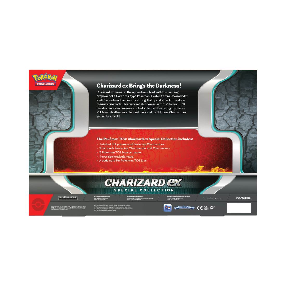 • 1 gravirana folijska promo karta s Charizardom ex • 2 folijski karti: Charmander in Charmeleon • 1 večja lentikularna karta – nagni jo in opazuj Charizardov napad v akciji! • 5 booster paketov Pokémon TCG (vsak vsebuje 10 kart in 1 osnovno energijo; vsebine se razlikujejo) • Koda za spletno igro Pokémon TCG Live ali Pokémon Trading Card Game Online