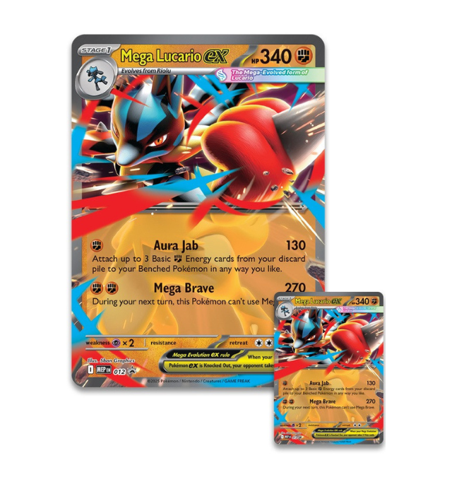 Pokémon TCG: Mega Lucario ex Figure Collection vključuje: • 1 bleščečo promo karto Mega Lucario ex • 1 povečano promo karto Mega Lucario ex • 1 figuro Mega Lucaria • 5 Pokémon TCG booster paketov • Kodo za Pokémon TCG Live