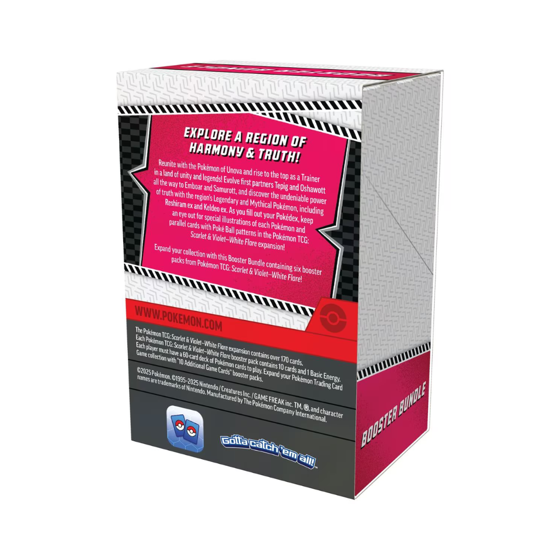 Pridruži se legendarnim Pokémonom iz regije Unova in postani vrhunski trener v deželi, kjer se prepletata enotnost in mit! Razvij svoje začetne Pokémon partnerje, kot sta Tepig in Oshawott, vse do mogočnega Emboarja in Samurotta. Odkrij pravo moč z legendarcema Reshiram ex in Keldeo ex ter napolni svoj Pokédex s kartami, ki izstopajo – s posebnimi ilustracijami in paralelnimi kartami z edinstvenimi Poké Ball vzorci v razširitvi Pokémon TCG: Scarlet & Violet – White Flare.