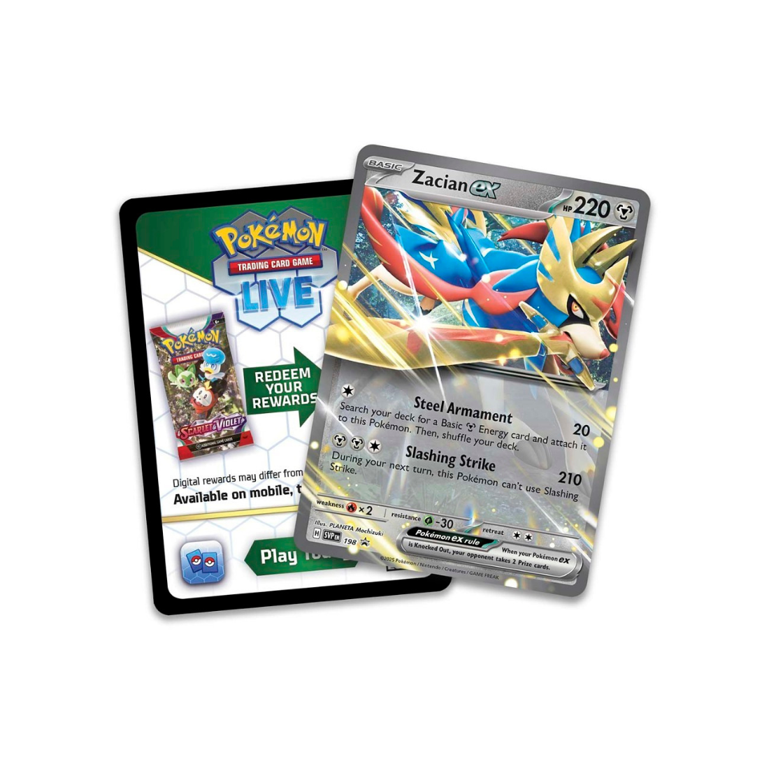 • 1 promo karto s Koraidonom ex ali Zacianom ex • 4 Pokémon TCG booster pakete (vsak vsebuje 10 kart + 1 osnovno energijo; vsebine se razlikujejo) • Kartico s kodo za spletno igro Pokémon Trading Card Game Live ali Online